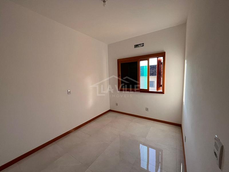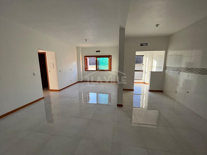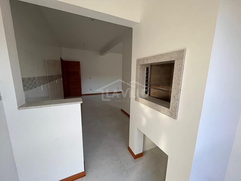 78m², dois dormitórios, banheiro, sala, cozinha, churrasqueira e garagem.