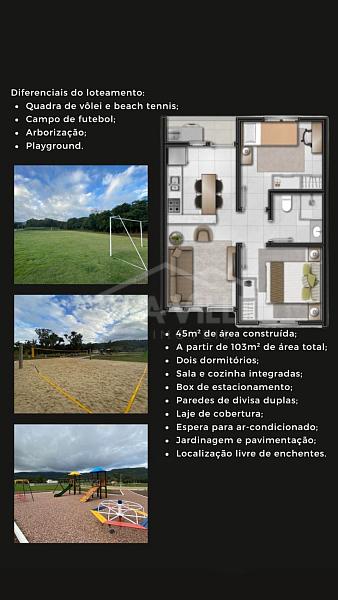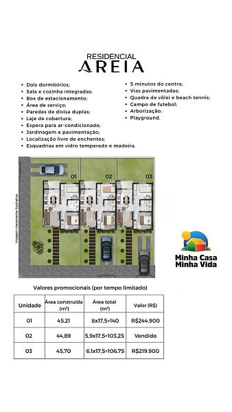 Casas com dois dormitórios, sala e cozinha integradas, box de estacionamento, área de serviço, paredes de divisa duplas, laje de cobertura, espera para ar-condicionado, jardinagem e pavimentação, localização livre de enchentes e esquadrias em vidro temperado e madeira