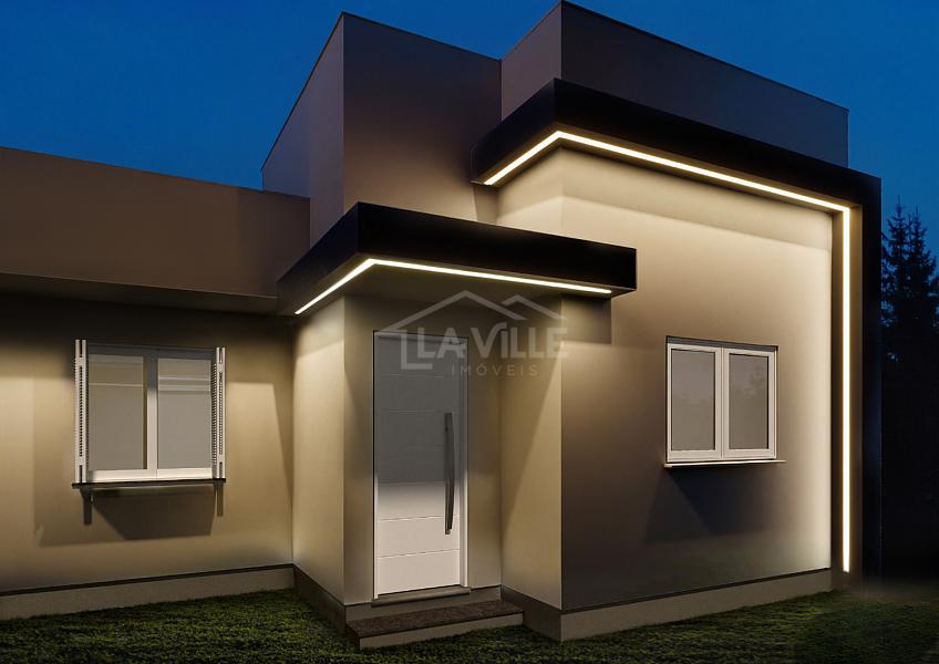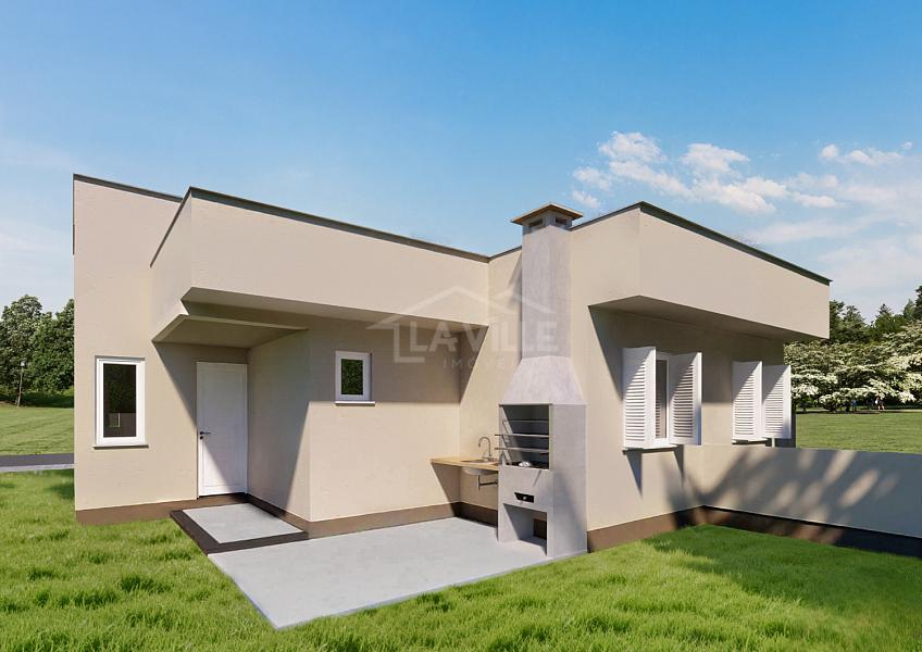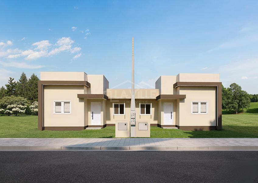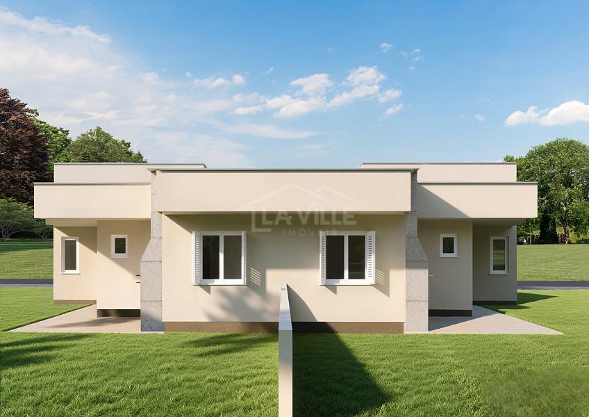 Casas com 2 dormitórios, 1 banheiro, sala e cozinha integradas, área de serviço e 2 vagas de garagem