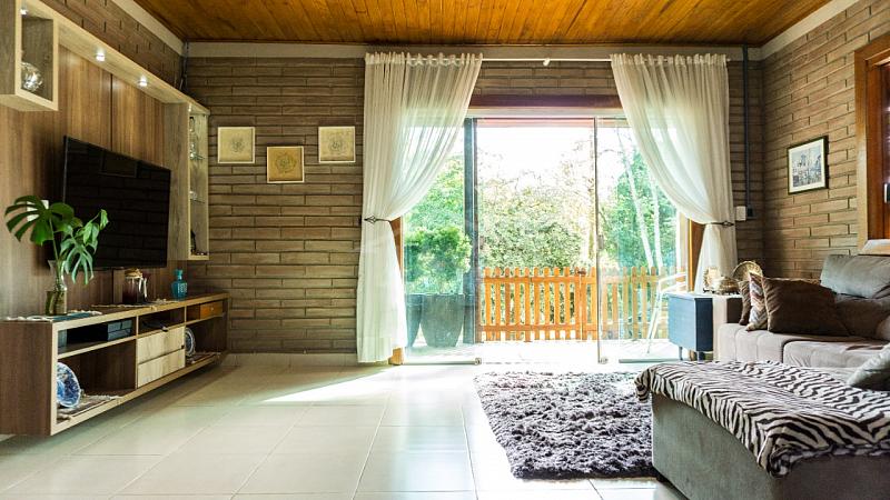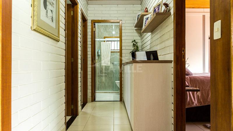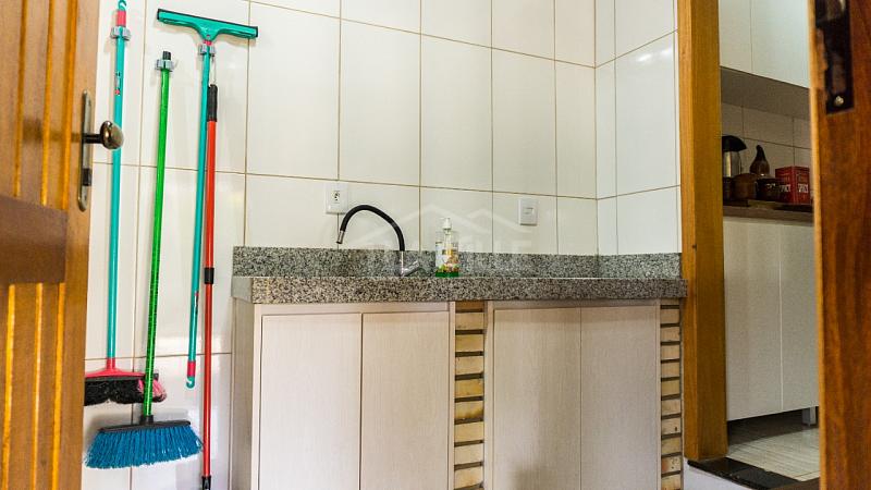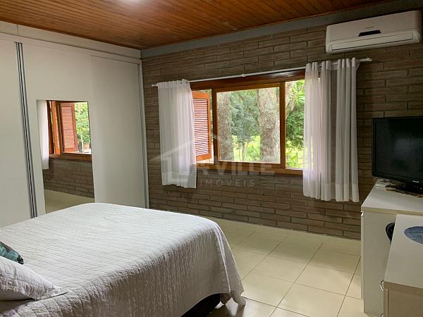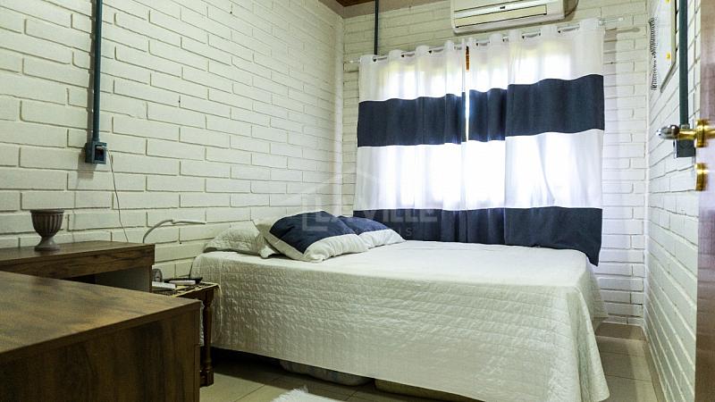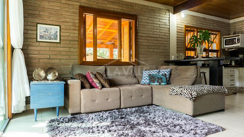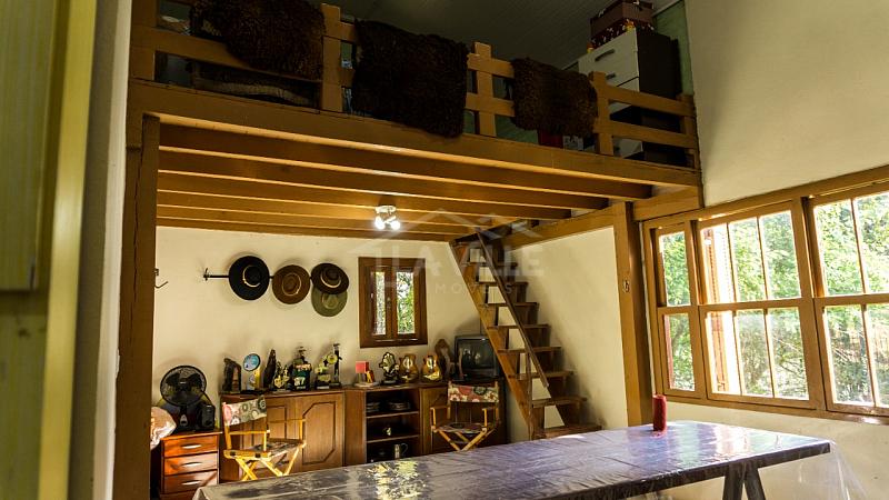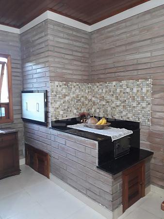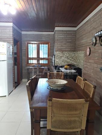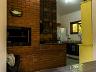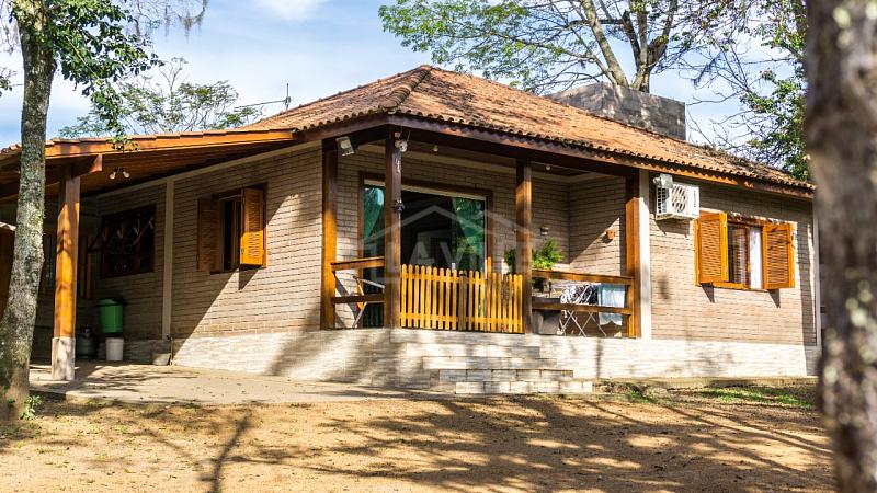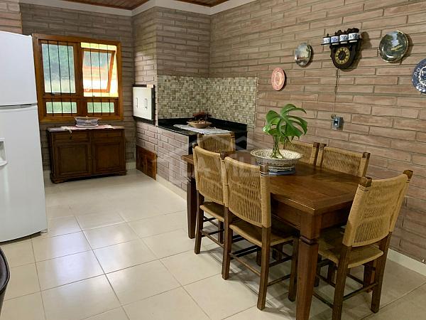 Casa Principal: Sala e cozinha integradas, 3 quartos, dois banheiros, churrasqueira, fogão a lenha e garagem privativa.